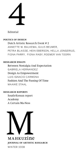 MaHKUzine. Journal of Artistic ResearchEditorial MaHKUzine #4, Winter 2008 The concept of the politics of design permeates the entire issue of MaHKUzine#4. To be sure, the politics of design do not refer to intrigues and machinations in the design world creating wicked plots and scenarios. Rather, the politics of design connects with current design fascinations evoked by globalization and sustainability creating novel design perspectives and design trajectories with an undercurrent of making our world a better place. The Research Essays reflect that design attitude. In Design as a Tool for the Empowerment of Producers from Underexposed Cultures to Participate in a Global World through the Internet, Luis Ignacio Carmona introduces the concept of Internet Cooperatives where consumers and producers will be partners in the development of sustainable, ecological and unique products. Fashion and the Passing of Time sees Maaike Staal suggest the term Trash-Worship for designers who use discarded materials in their creations; they employ the remnants of our consumer society as a base for new designs for that same society. In fact, they revalue our own garbage. In Between Nostalgia and Expectation, Gabriela Hernández argues that public space is where a culture reflects its past and its aspirations. Deploying Baudrillard's simulacra and simulation theory as background Hernández develops a specific line of thought in order to illustrate and understand nostalgia and expectation in different public places from different poles. In the Dare #2 symposium The Politics of Design - a satellite project of Utrecht Manifest's 2nd Biennial for Social Design - various speakers address a similar design attitude. Casco's Fiona Parry reports on positions taken. Speaker Petra Blaisse uses the curtain as a quietly political tool that is capable of altering and subsequently questioning the fixedness of architectural space. Both Hella Jongerius and Fiona Raby, encircling the symposium as first and last speaker respectively, discuss how designers can affect the way people think about choice, including choosing to think about the future. Guus Beumer focuses on fashion design and the fashion industry and shows how design has affected how we even think about what the future is. Hein Eberson's Second Life lecture voices concerns for a designer in relation to the increasing prominence of online activity and its impact on forms of communication, privacy and security. One of the concepts Roemer van Toorn introduces is the Society of the And where ideas once held at a distance by binary opposition can be joined together creating a context in which designers and architects must now work in order to produce socially responsible design. In MaHKUzine#4, Van Toorn and moderator Annette W. Balkema further discuss the validity of the Society of the And. Last but not least, the Research Reports point out that art no longer uses traditional contexts, but appears to create its own platforms able to continuously produce novel, interdisciplinary contexts. That recontextualizing turn also implies that the artist always needs to reflect on the connection of art, public, and public domain. Wim Marseille discusses the rhetorical opposition of a why- and a why not- attitude in the design process while reporting on a series of research lectures in South Korea addressing the issue of global design. (AWB) editorial board HENK SLAGER (general editor) ANNETTE W. BALKEMA ARJEN MULDER BIBI STRAATMAN editorial consultants KLAAS HOEK WIM MARSEILLE CHRIS VERMAAS MASCHA VAN ZIJVERDEN final editing ANNETTE W. BALKEMA language editing JENNIFER NOLAN translations GLOBAL VERNUNFT design MaHKU/MA Editorial Design (THOMAS CLEVER) . typeface Swift (by GERARD UNGER) , BE Akzidenz Grotesk earn MaHKU is part of the European Artistic Research Network, together with Helsinki School of Art, Helsinki; Malmo School of Art, Malmo; NCAD School of Art, Dublin; Slade School of Art, London; Vienna School of Art, Vienna. participants ANNETTE W. BALKEMA Lecturer in Analysis in Spatial Design, MaHKU, Utrecht GUUS BEUMER, Director Marres and NAI, Maastricht PETRA BLAISSE, Interdisciplinary Designer, Inside Outside, Amsterdam LUIS IGNACIO CARMONA, MaHKU Graduate Design, Editorial Design HEIN EBERSON. Lecturer Editorial Design, MaHKU, Utrecht GABRIELA HERNANDEZ, MaHKU Graduate Design, Urban Design HELLA JONGERIUS, Product Designer, Rotterdam WIM MARSEILLE, Courseleader MA Interior Design, MaHKU, Utrecht FIONA PARRY, Curatorial assistant Casco, Utrecht FIONA RABY, Professor of Interaction Design, Royal College of Art, London MAAIKE STAAL, MaHKU Gradaute Design, Fashion Design ROEMER VAN TOORN, Professor Projective Theory Program, Berlage Institute, Rotterdam MaHKUzine#1, summer 2006 MaHKUzine#2,winter 2007 MaHKUzine#3, summer 2007 MaHKUzine#4, winter 2008 MaHKUzine#5 , summer 2008 |  |